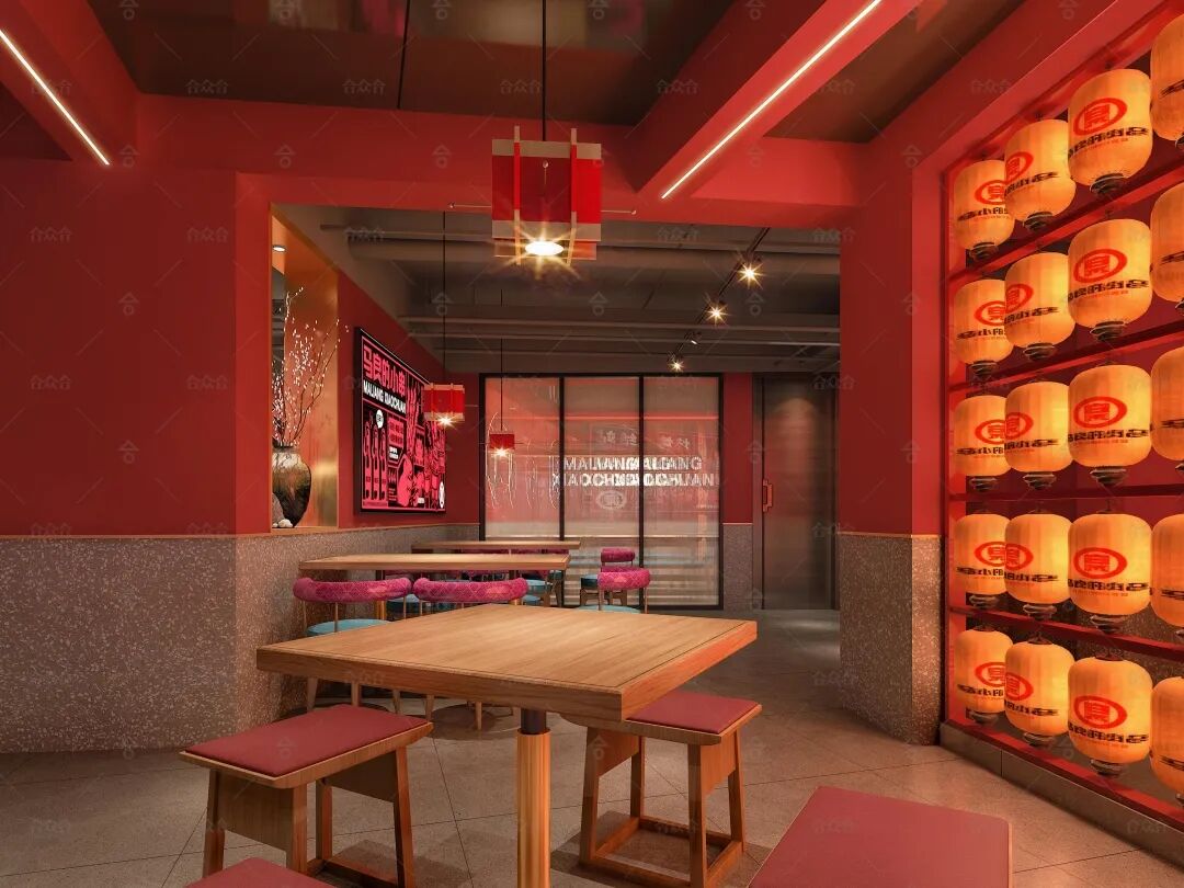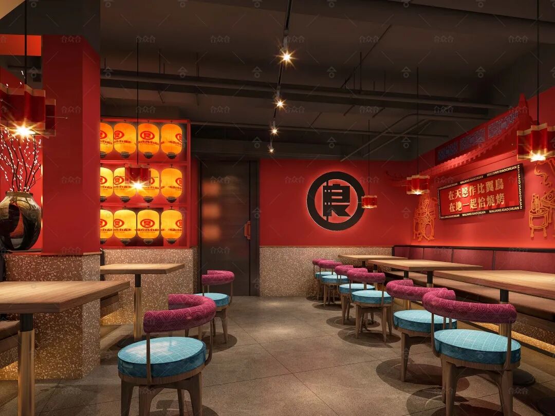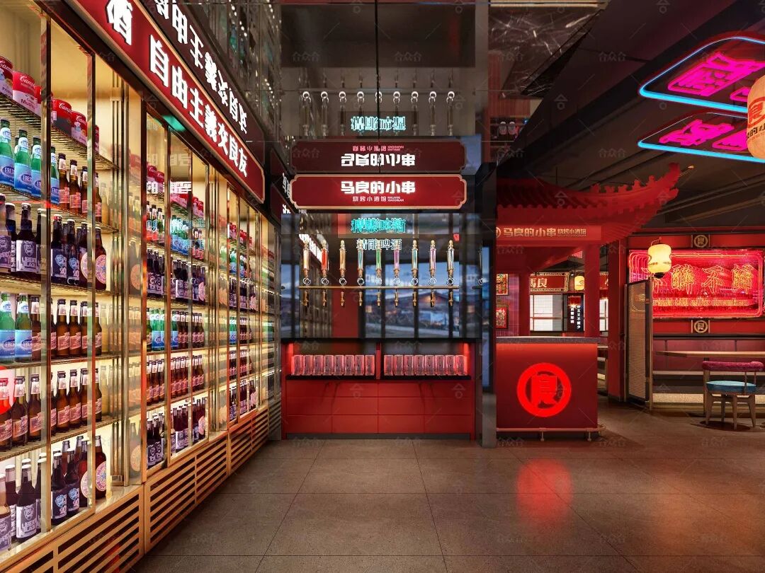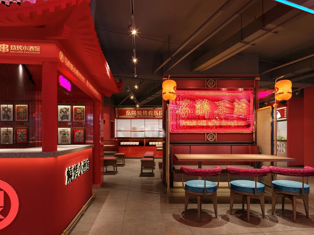 图源马良的小串品牌方 红黑配色同样一脉相承至空间设计领域,大面积高饱和度的红黑撞色营造空间着你氛围,霓虹发光字的出现则打破沉闷,洒脱率性,将室内色彩丰富化,营造一处极富国风感的复古范儿小酒馆。