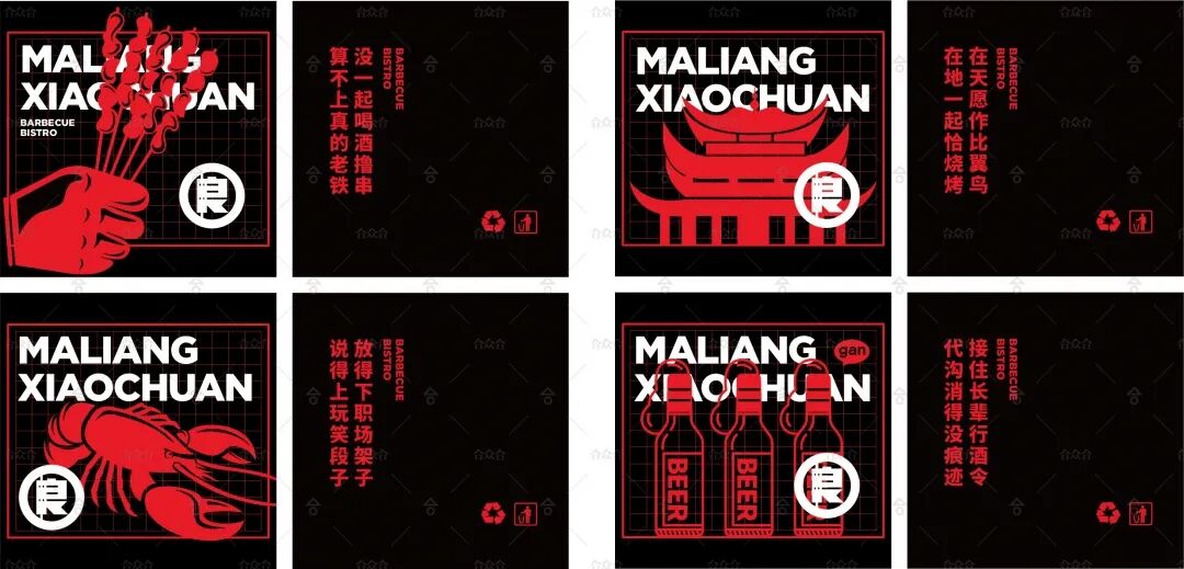 大面积红黑色块相间的品牌色运用同样复古夜店风十足,迎合品牌夜宵、小聚、微醺的场景氛围,与古诗词的结合又带热烈国潮感,极具视觉冲击力,是消费者拍照打卡的最爱。