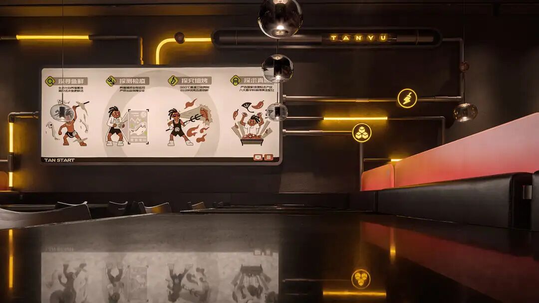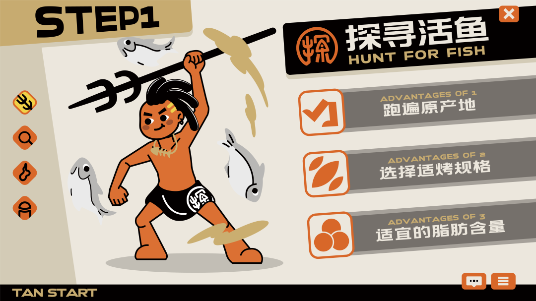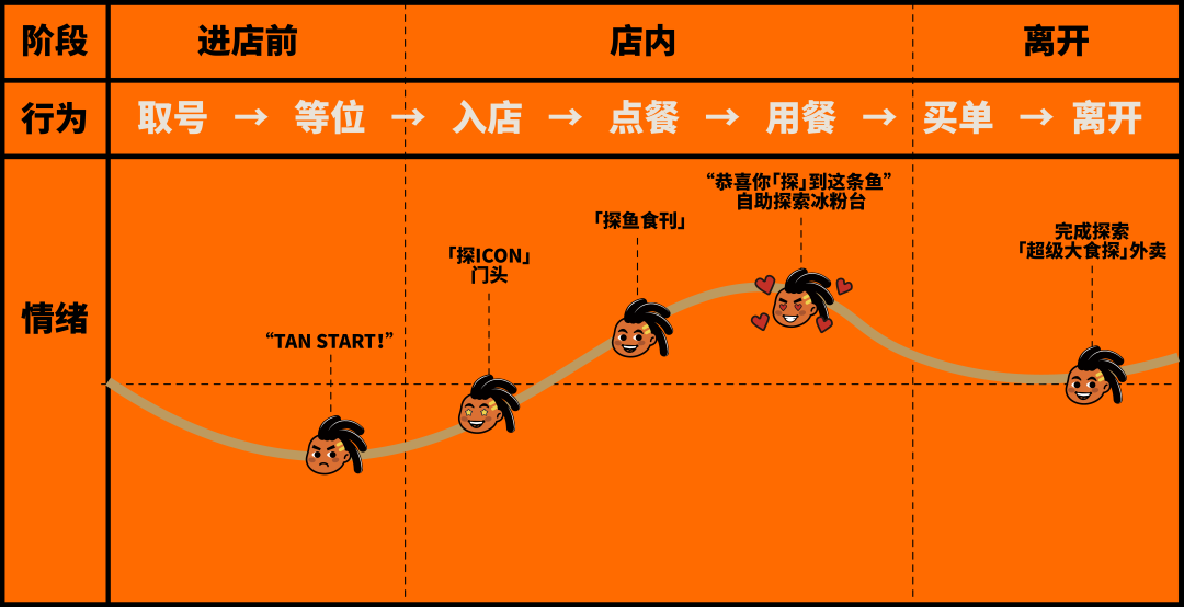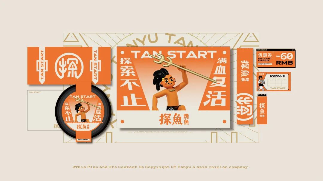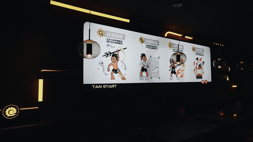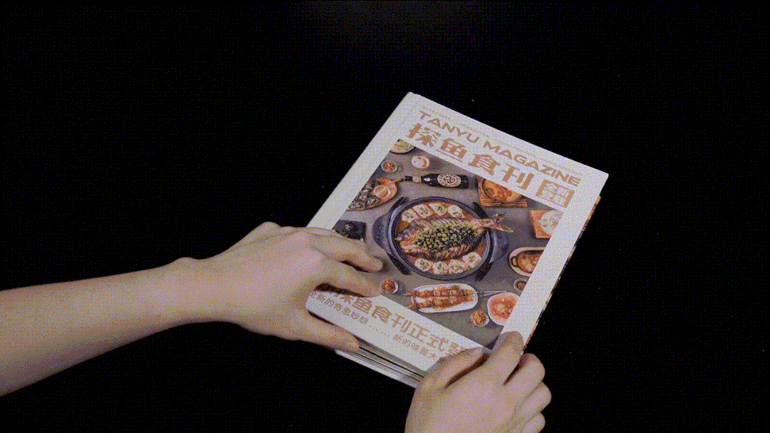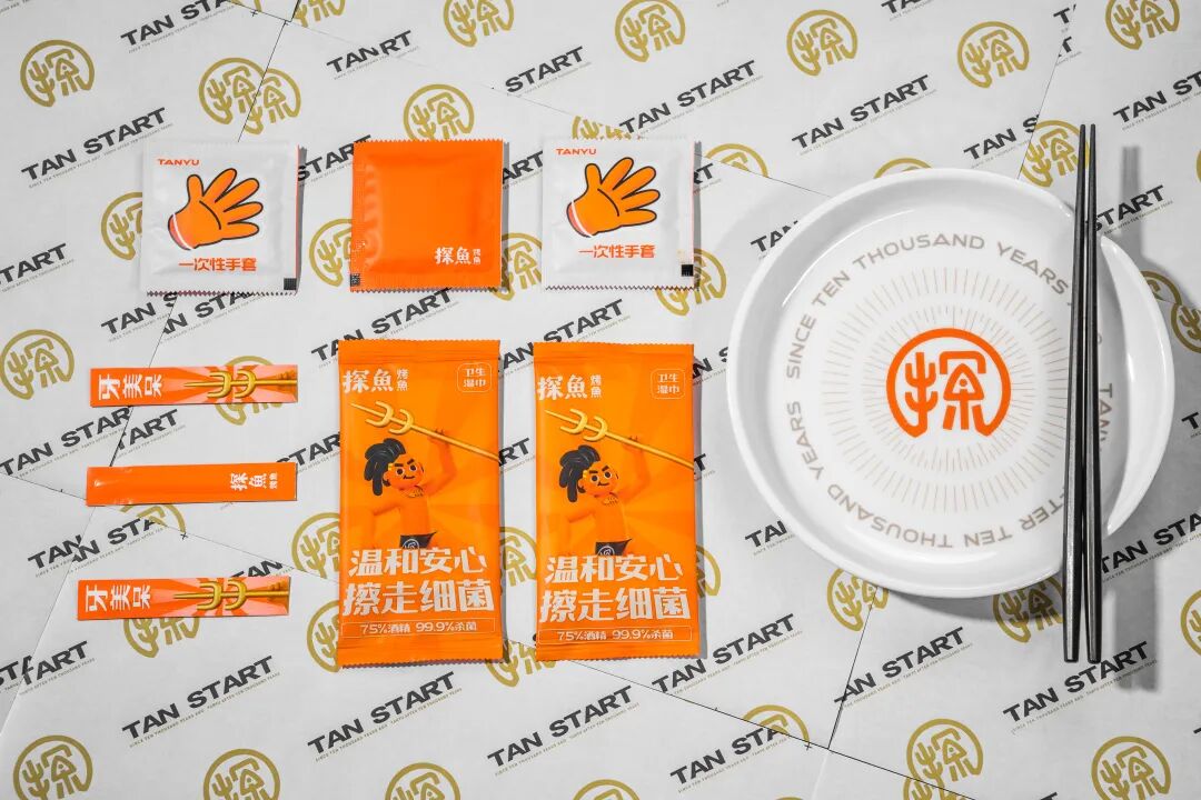 TAN START!——从进店邀请“爽麻无限,开心吃鱼”+「探ICON」延展的门头;点餐的「探鱼食刊」地图;上菜的“恭喜你「探」到这条鱼” → 拔叉用餐