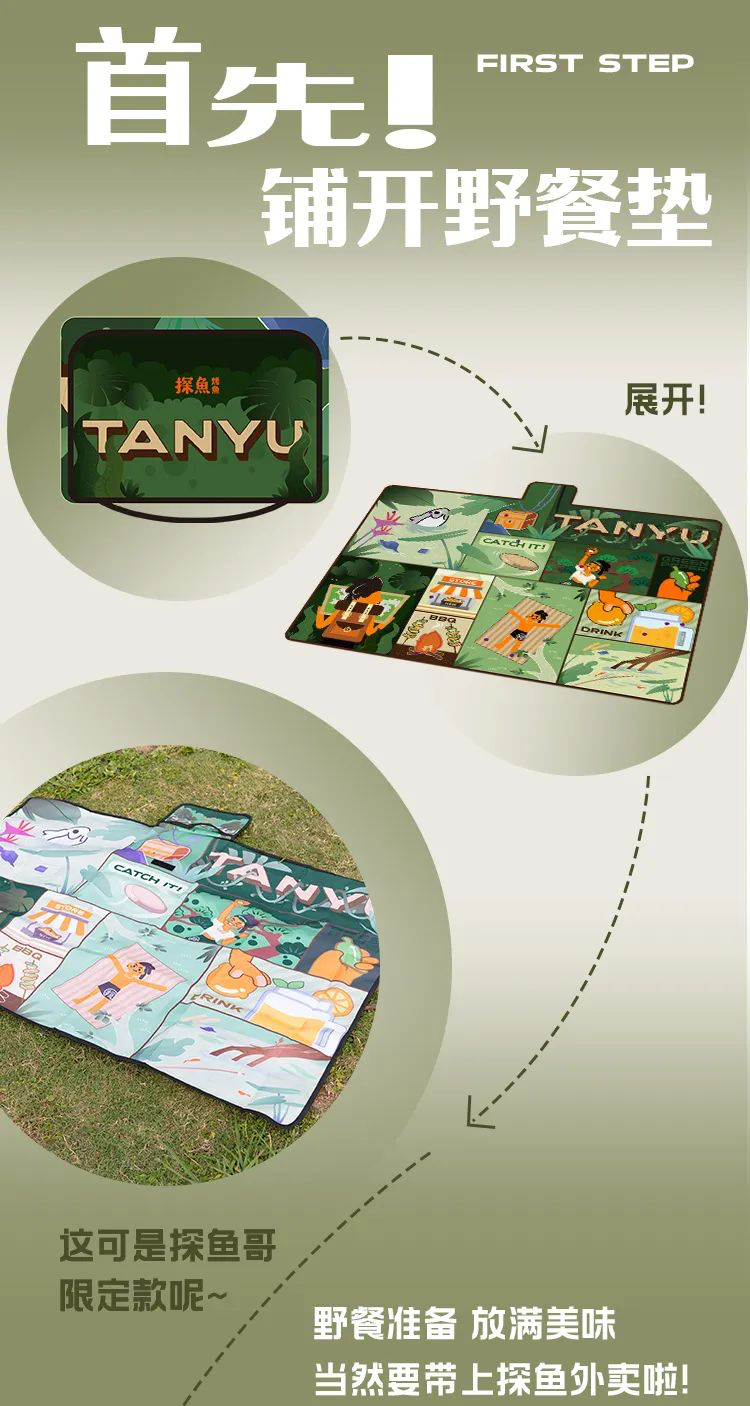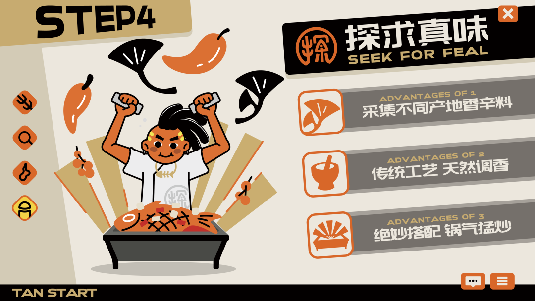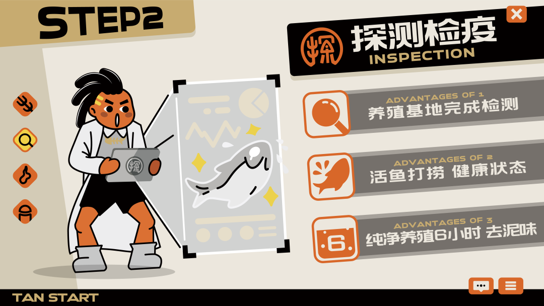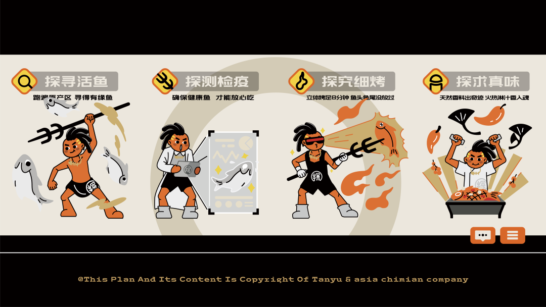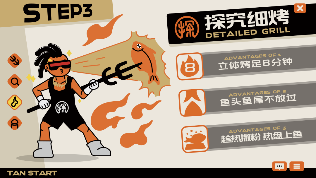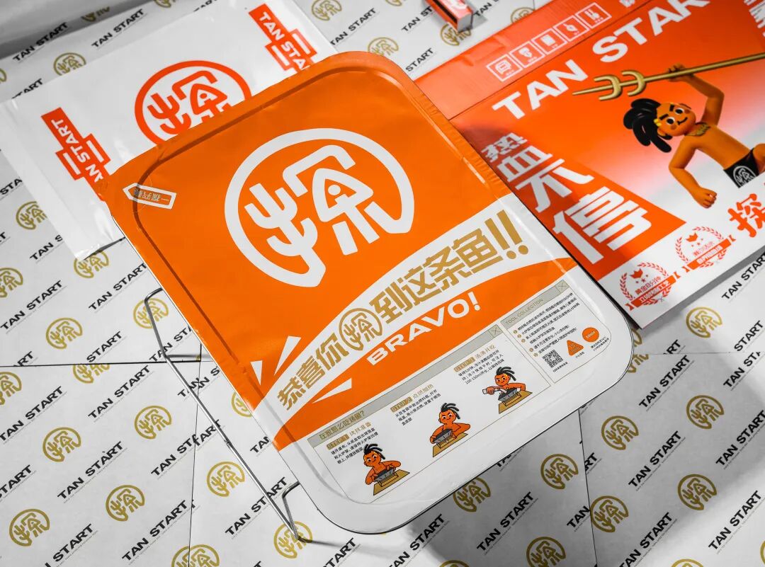 TAN START!——从进店邀请“爽麻无限,开心吃鱼”+「探ICON」延展的门头;点餐的「探鱼食刊」地图;上菜的“恭喜你「探」到这条鱼” → 拔叉用餐