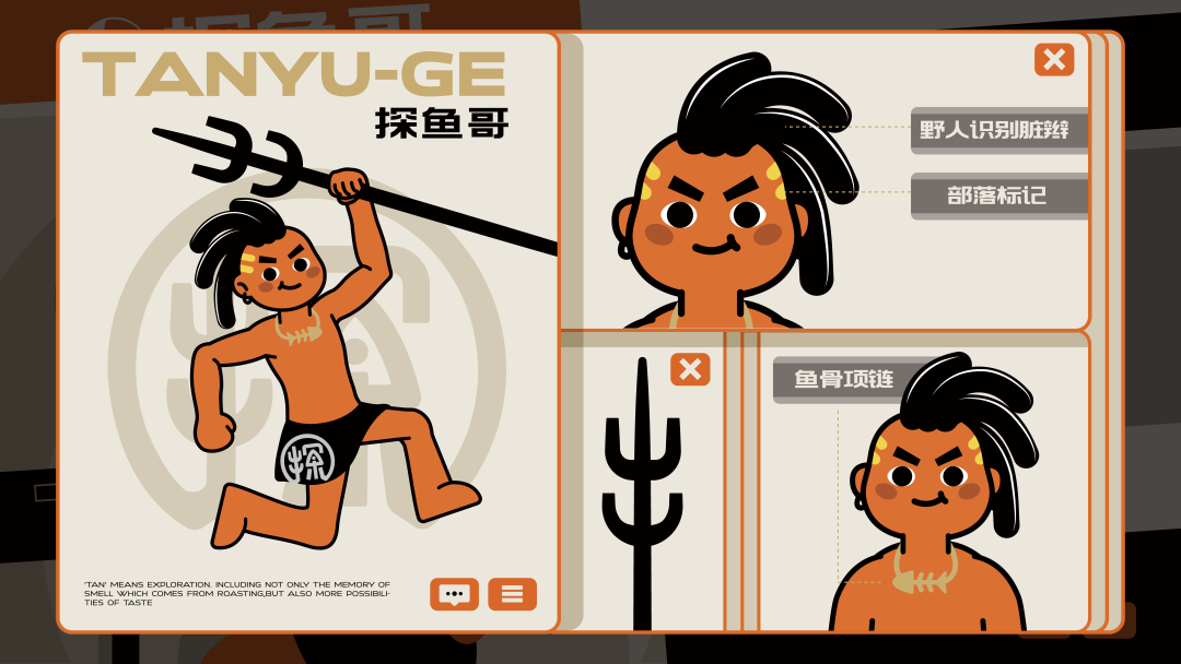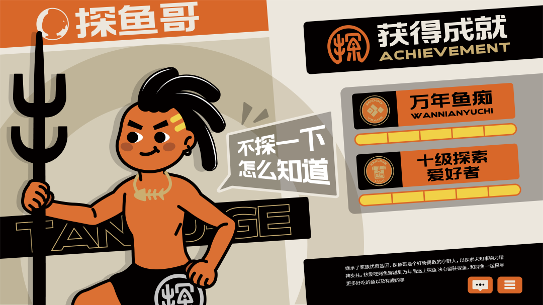 根据探鱼的文化母体"一万年前就烤鱼,一万年后吃探鱼",提取一名远古时期的人物作为品牌IP,名为「探鱼哥」。