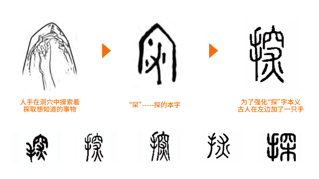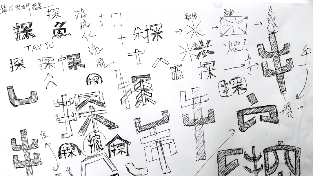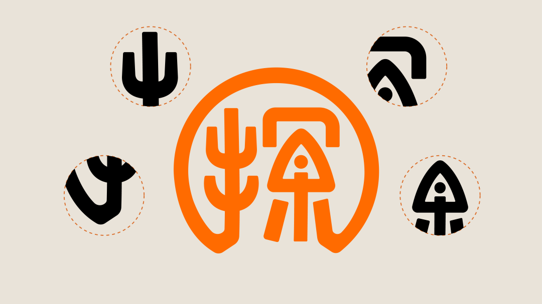 结合探鱼烤鱼品类及品牌核心精神「探索」进一步视觉化提炼,由甲骨文「探」字含义:手在洞中探索,演变为「探ICON」,亦是高度凝练的文化符号。