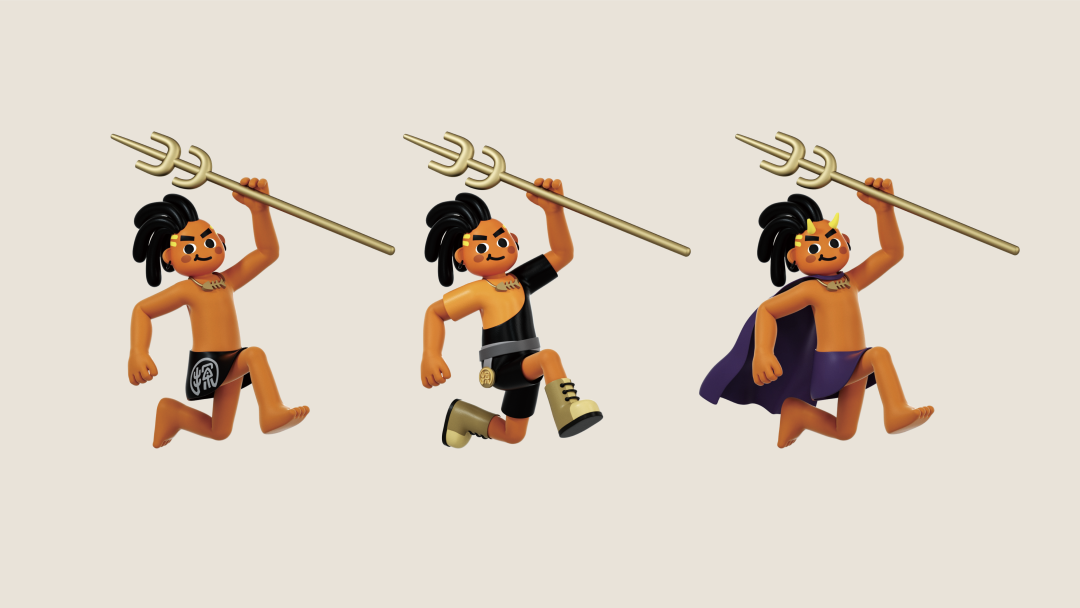 ,颈部的鱼骨项链和腰部的「探ICON」,强化探鱼烤鱼品类及品牌属性。面部颜料笔画为部落标志,延续独特辫子识别,深化食探角色记忆点。