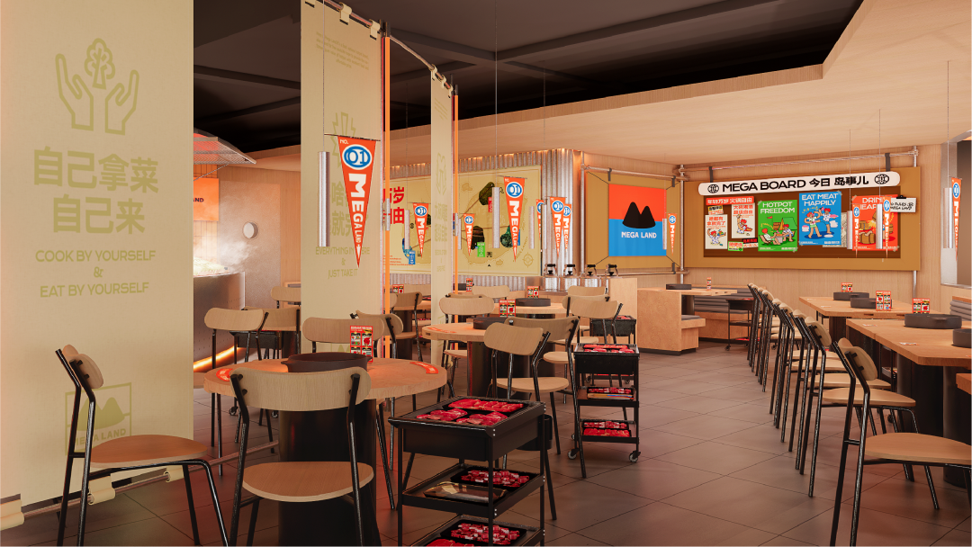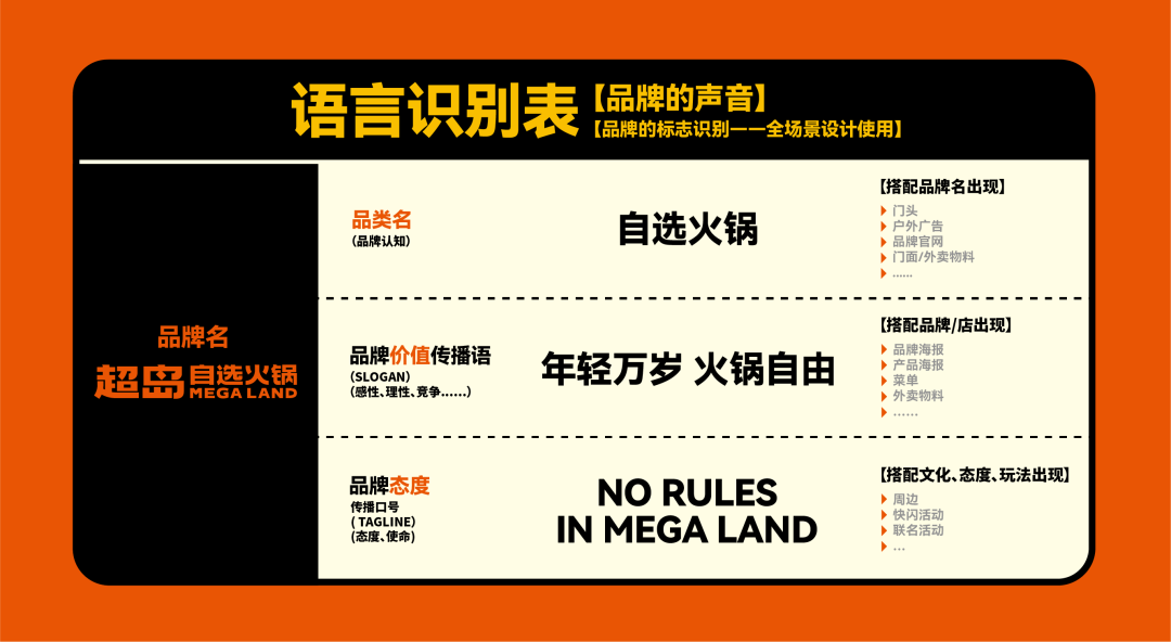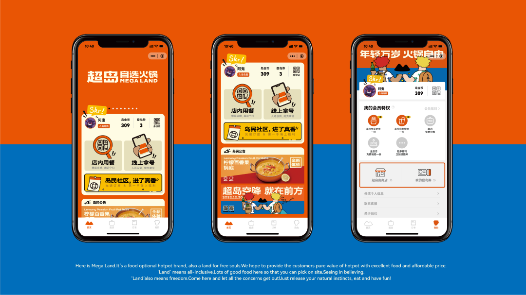 在语言的传播中,除了传达品类上的创新,也将融入超岛“自由”的灵魂,让「火锅自由」成为走进年轻人生活的一种态度表达。 Slogan「年轻万岁,火锅自由」给消费者传递在这里吃火锅是自由无负担的,同时这也是一个适合年轻人社交聚餐的地方,来了超岛即拥抱“自由”,这里可以释放年轻人的天性。 品牌Tagline「No rules in mega land」完善超岛的品牌表达,输送超岛的品牌精神与态度。火锅可以是一次狂欢、可以是美味的犒赏,也可以是情绪的宣泄口,在这里没有束缚,超岛是“随时能去的聚集地”,只要你想,超岛可以是任何样子。