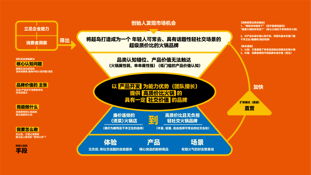 目前大多数消费者对超岛有产品价值低的认知: ① 超岛本身的优势——「高品质食材」无法让消费者有效感知; ② 在场景上,过多的功能信息以及店内氛围给人「快餐」的感知; ③ 自助的方式时常使得消费者在结账时价格高出预期,让消费者觉得超岛「贵」,带来不好的印象。 所以我们梳理出超岛的品牌升级策略,将品牌原有的“廉价”认知,重塑为消费者对超岛的新认知,让消费者觉得「超岛=无负担、高质价比的火锅品牌」。