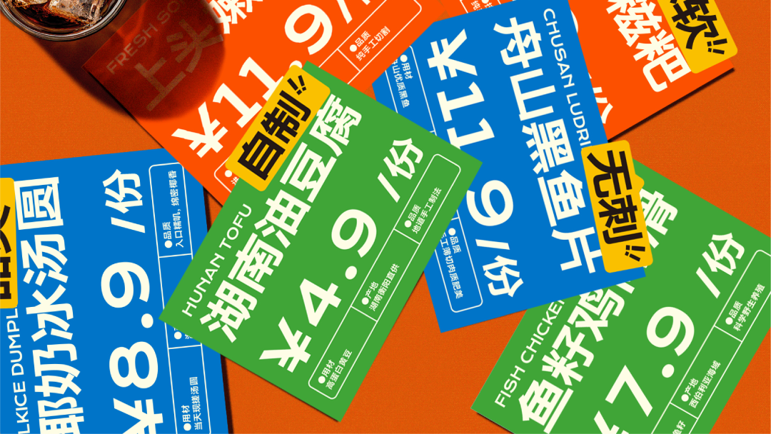 消费者从到店到选菜的体验中,海报也是影响产品价值感知的关键触点。在海报的处理上,我们该如何体现超岛的“高质价比”和“无负担”呢? 一切仍然回归到产品品质,好的产品是无需多余的修饰和包装的,我们要做的是回归产品属性,还原产品本身的价值。 于是我们将「自选市集」的模式,融合体现产品专业感的「标签」,结合为超岛海报的视觉语言。
